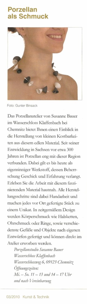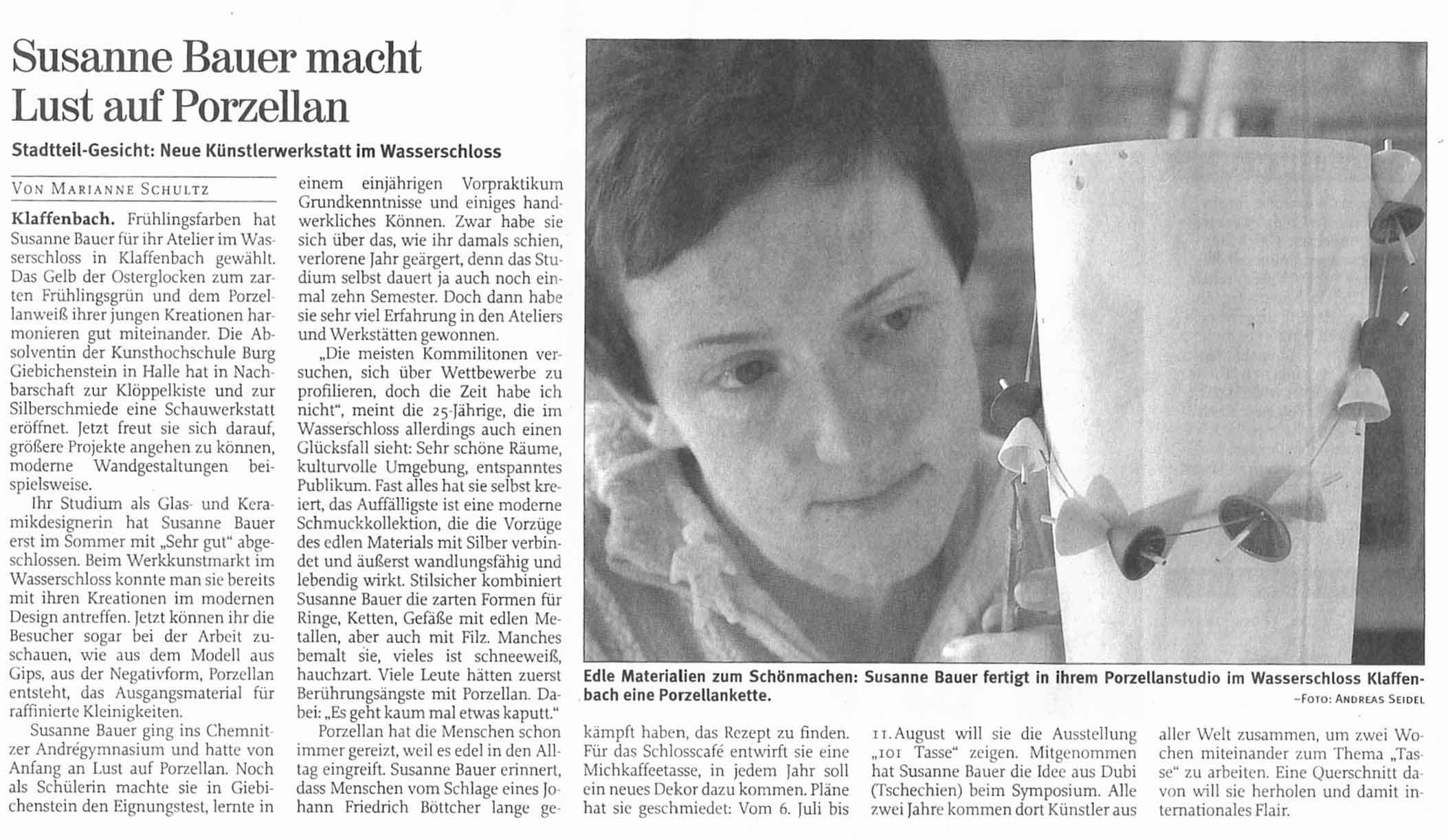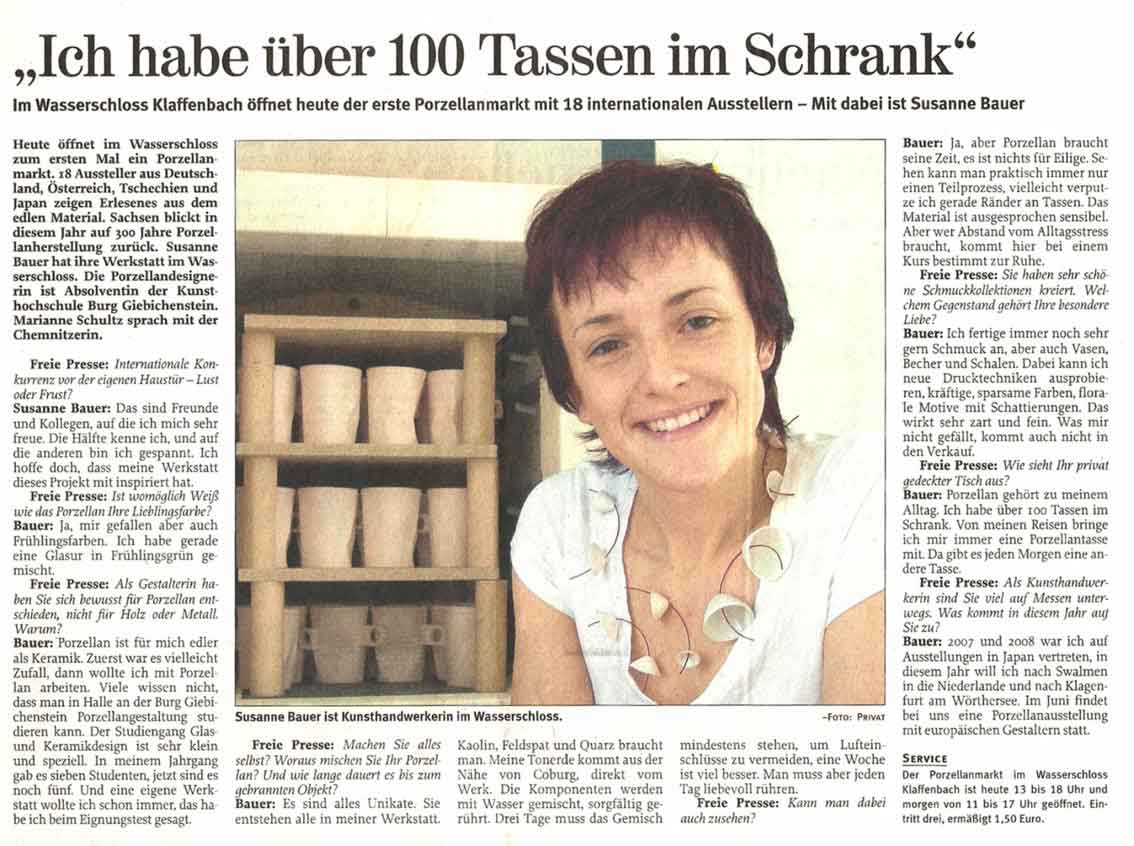 seit 2007 | - | freiberufliche Tätigkeit als Diplomdesignerin, Eröffnung des Porzellanstudios im Wasserschloss Klaffenbach, zahlreiche nationale und internationale Ausstellungs- und Wettbewerbsbeteiligungen |